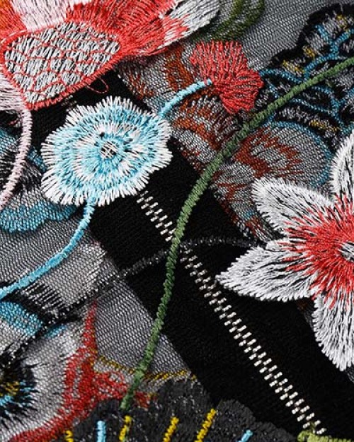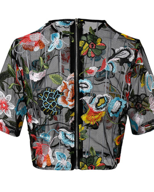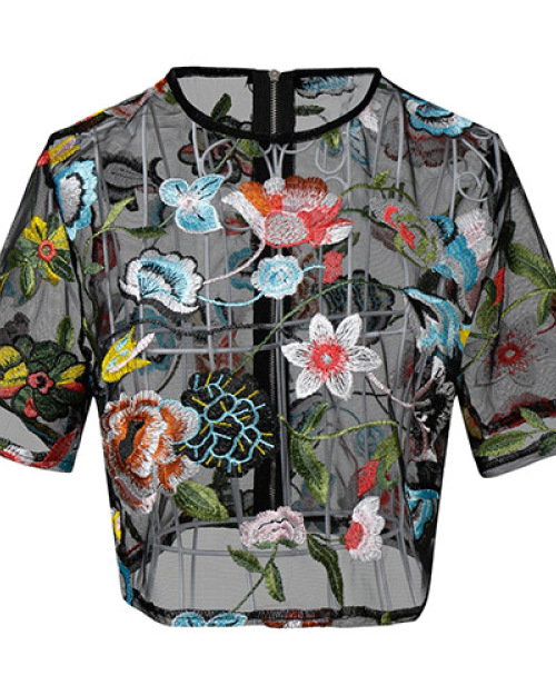 Sexy Round Neck Short Sleeves Printed See-Through Black Polyester Shirts(Without Lining)
