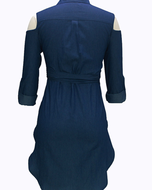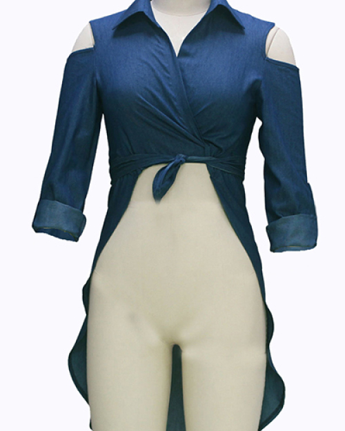 Sexy Turndown Collar Long Sleeves Asymmetrical Blue Denim Shirts