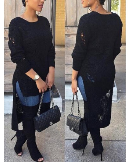 Stylish Round Neck Long Sleeves Black Cotton Sweaters