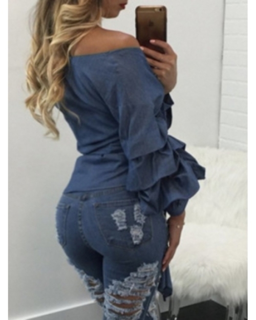 Stylish V Neck Long Sleeves Falbala Design Blue Polyester Shirts