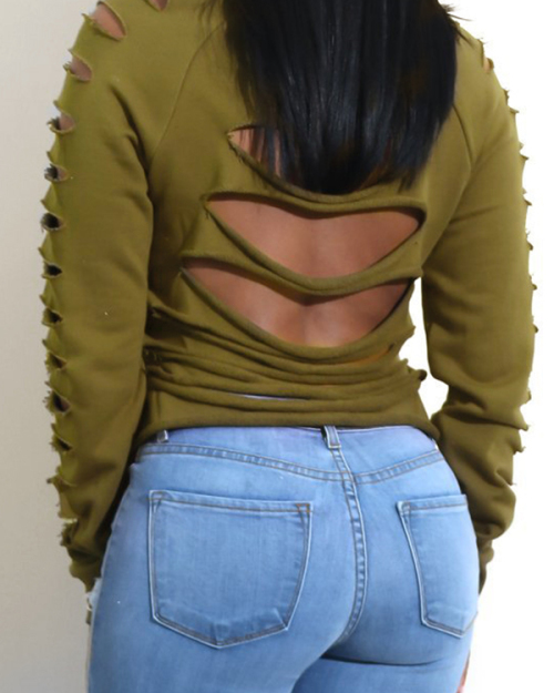Fashionable Round Neck Hollow-out Green Spandex Hoodies
