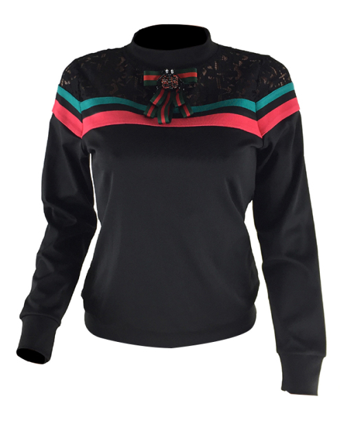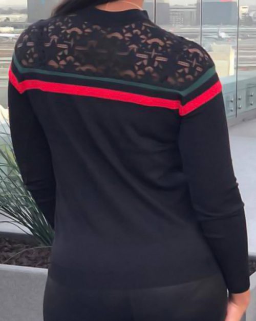 Stylish Round Neck Lace Patchwork Striped Black Cotton T-shirt
