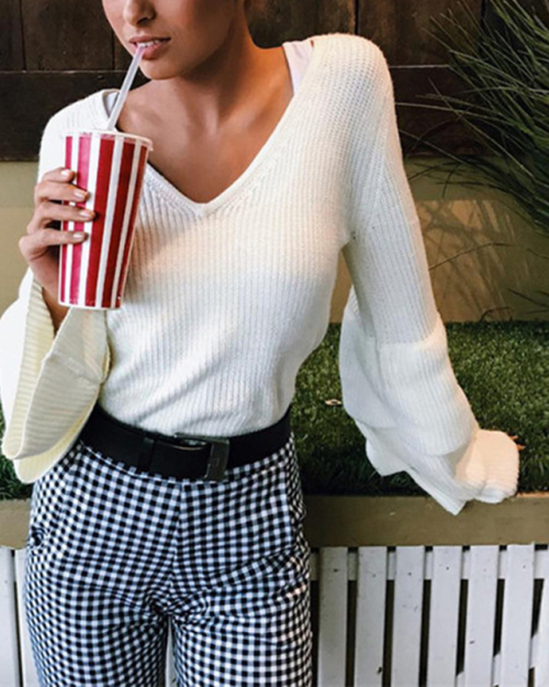 Trendy V Neck Long Sleeves Trumpet Type Design White Cotton Blends Sweater