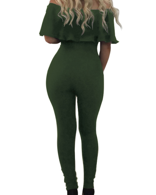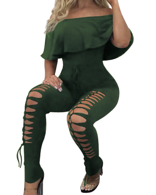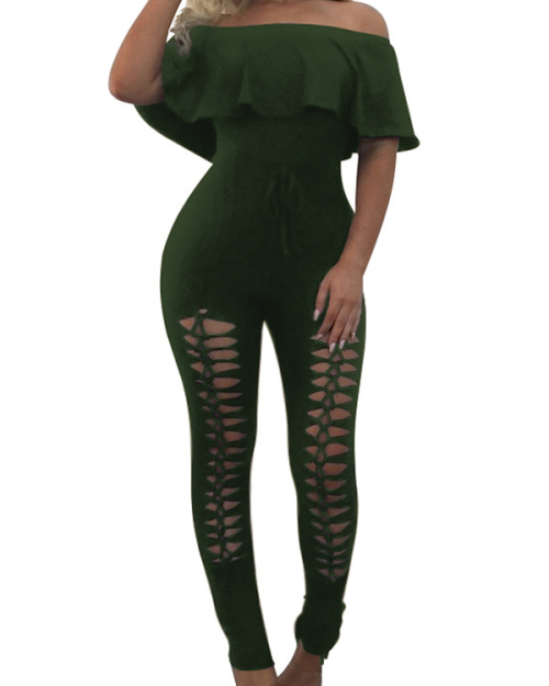 Trendy Dew Shoulder Hollow-out Army Green Polyester One-piece Jumpsuits