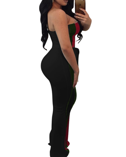 Trendy Dew Shoulder Striped Patchwork Black Polyester One-piece Jumpsuits(With Belt)