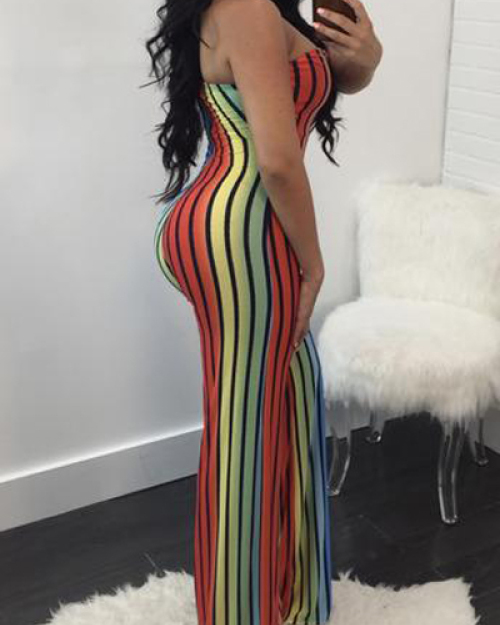 Trendy Dew Shoulder Striped Patchwork Milk Fiber One-piece Jumpsuits