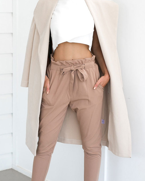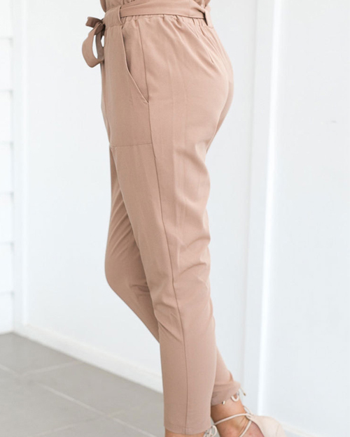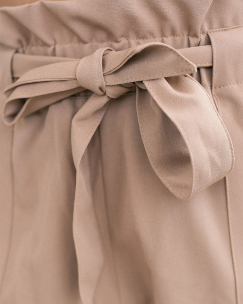 Trendy Elastic Waist Lace-up Khaki Cotton Blends Pants