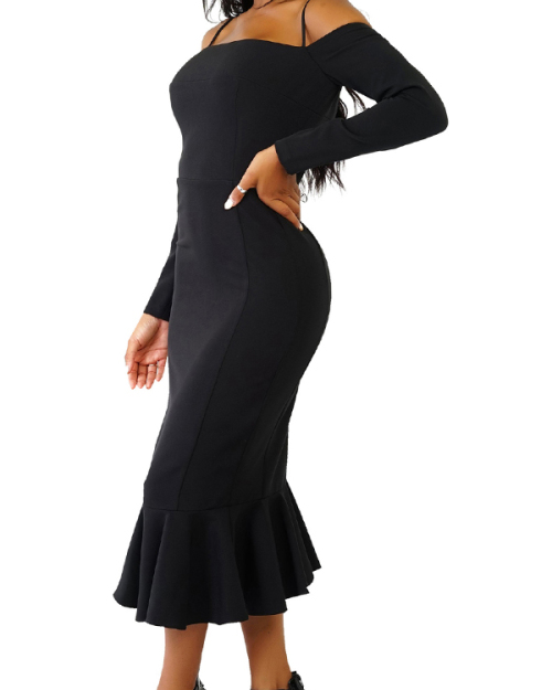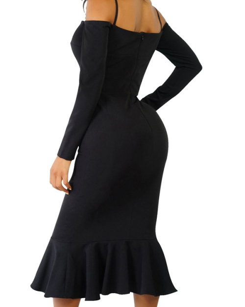 Trendy Falbala Design Black Polyester Sheath Mid Calf Dress