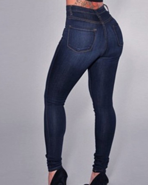 Trendy High Waist Zipper Design Deep Blue Denim Jeans