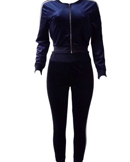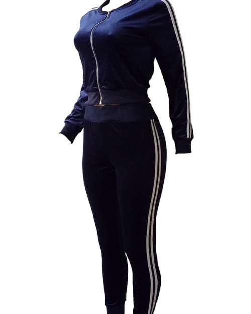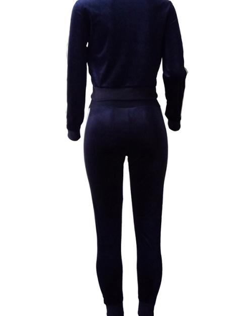 Trendy Mandarin Collar Striped Deep Blue Velvet Two-piece Pants Set