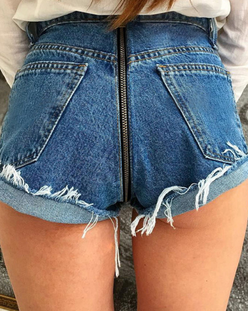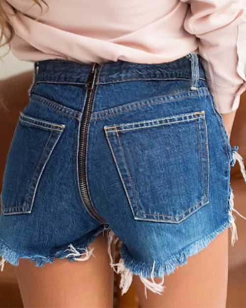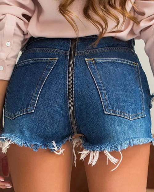 Trendy Mid Waist Worn Out Design Dark Blue Denim Zipped Shorts