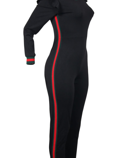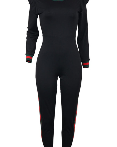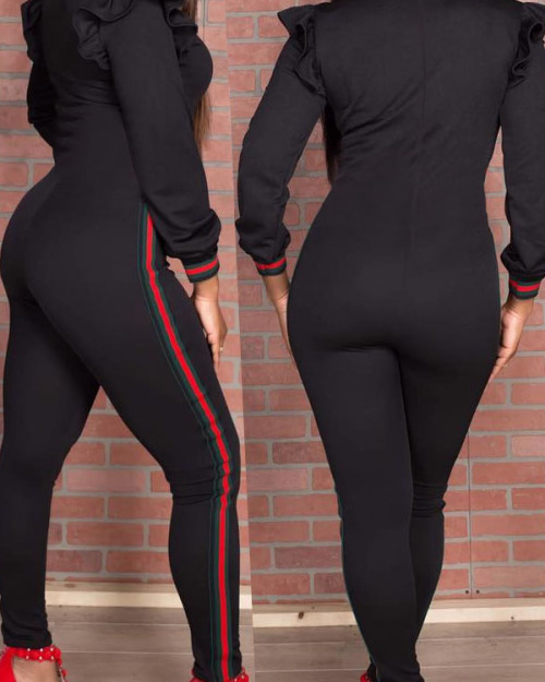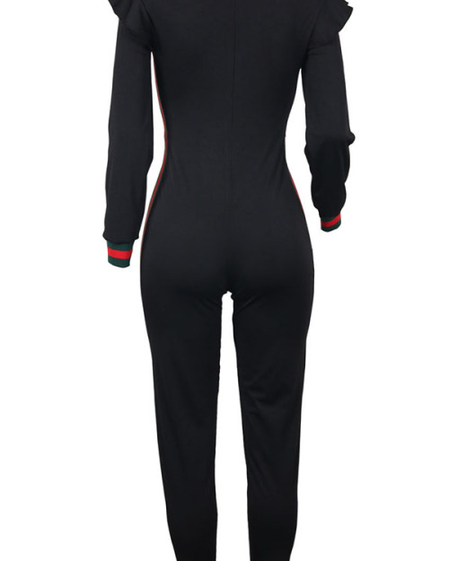 Trendy Round Neck Falbala Design Black Polyester One-piece Jumpsuits