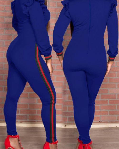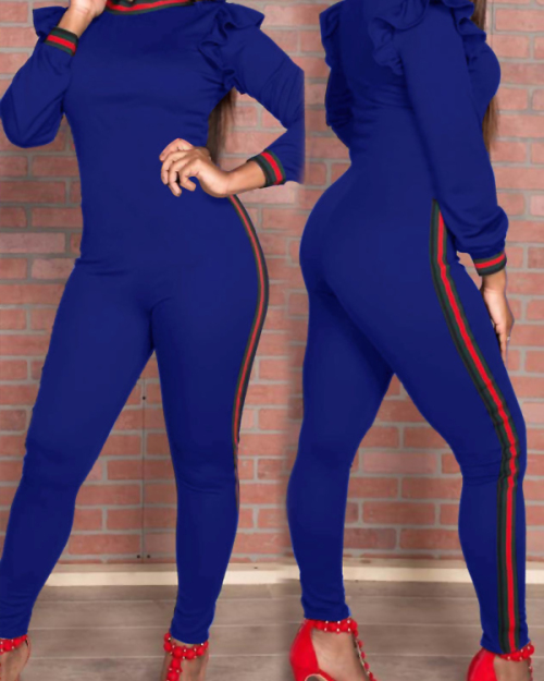 Trendy Round Neck Falbala Design Blue Polyester One-piece Jumpsuits