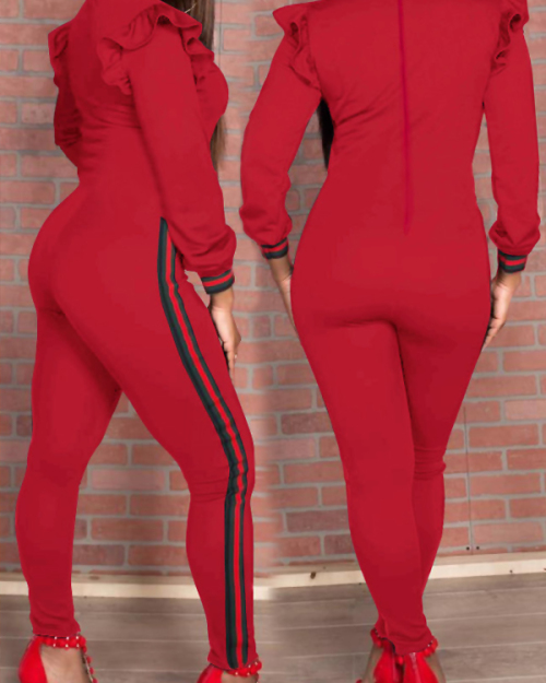 Trendy Round Neck Falbala Design Red Polyester One-piece Jumpsuits