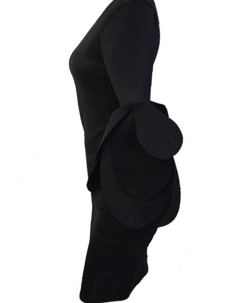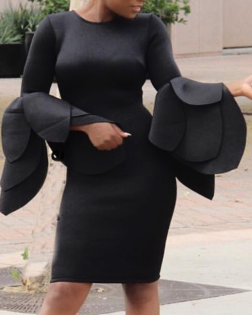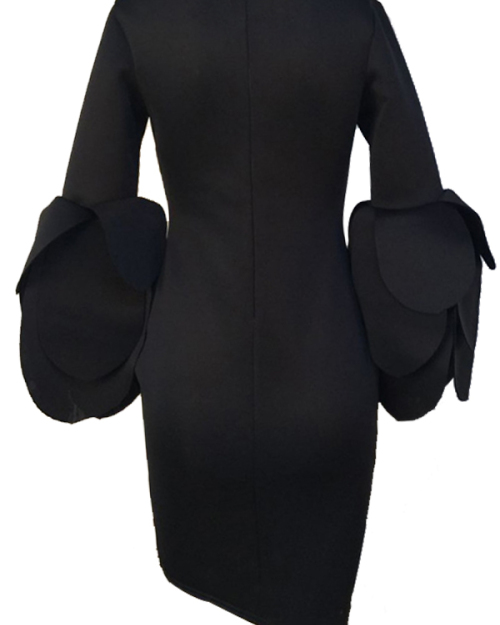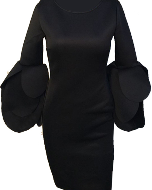 Trendy Round Neck Horn Sleeves Black Cotton Blend Sheath Knee Length Dress