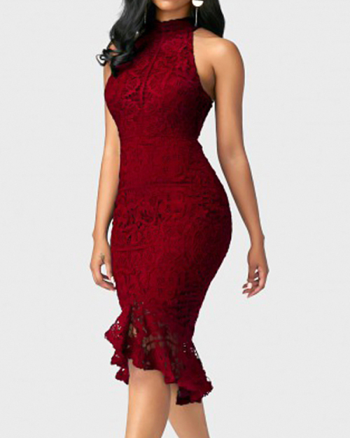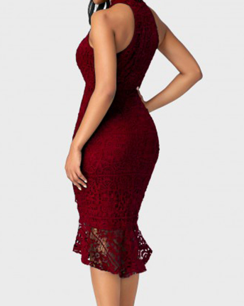 Trendy Round Neck Lace Trim Patchwork Wine Red Sheath Mid Calf Dress