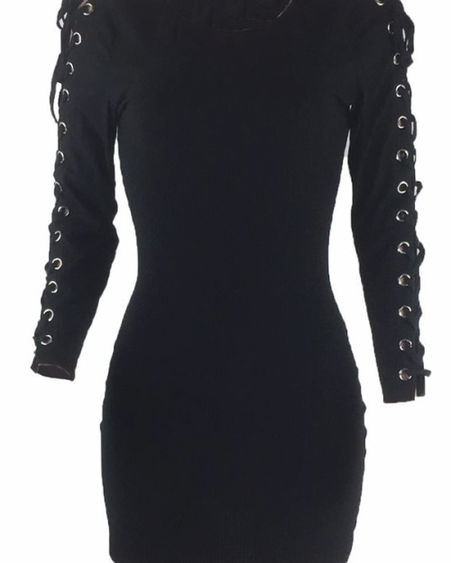 Trendy Round Neck Lace-up Hollow-out Black Cotton Sheath Mini Dress