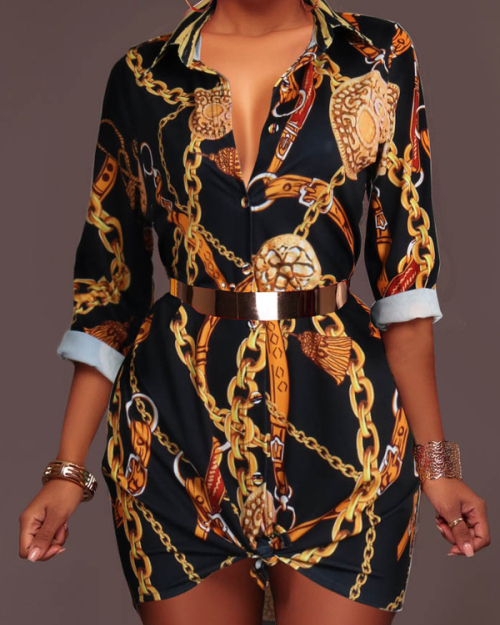 Trendy Turndown Collar Printed Black Healthy Fabric Mini Dress(Without Belt)