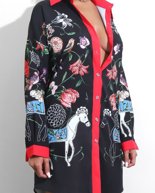 Trendy Turndown Collar Printed Black Polyester Mini Dress