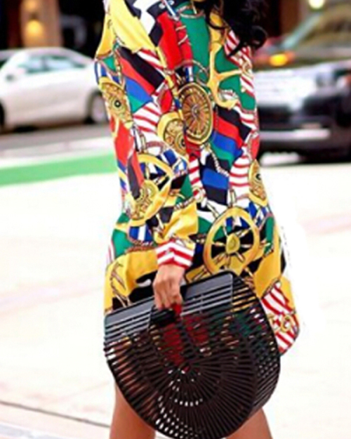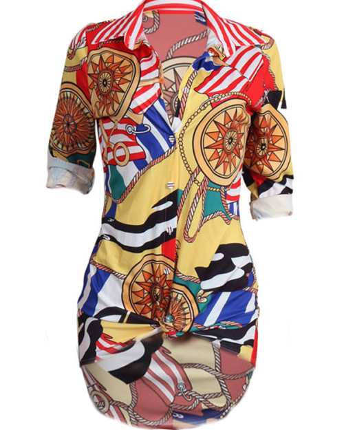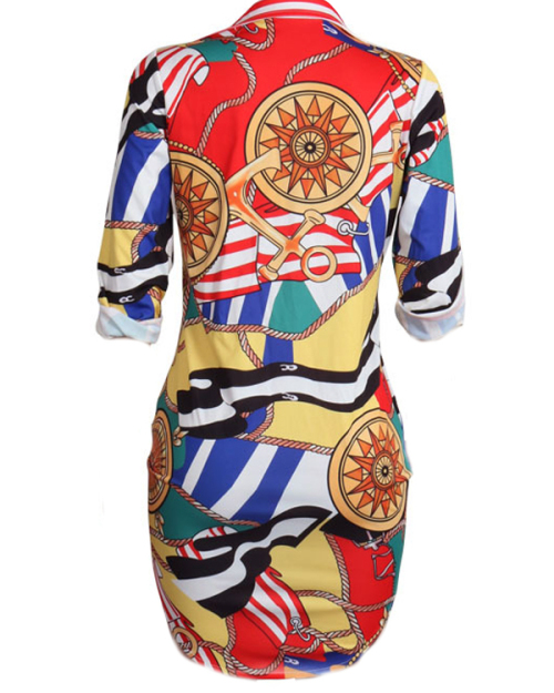Trendy Turndown Collar Printed Healthy Fabric Mini Dress(Without Belt)