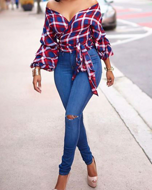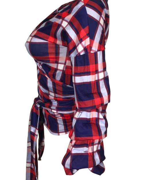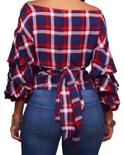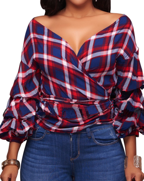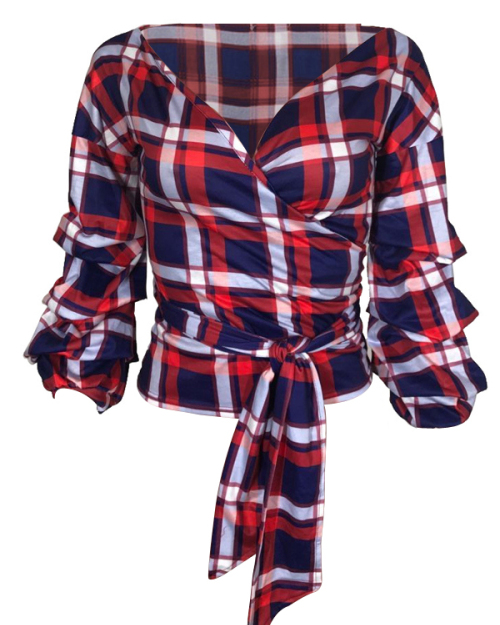 Trendy V Neck Dew Shoulder Plaids Red Polyester Shirts