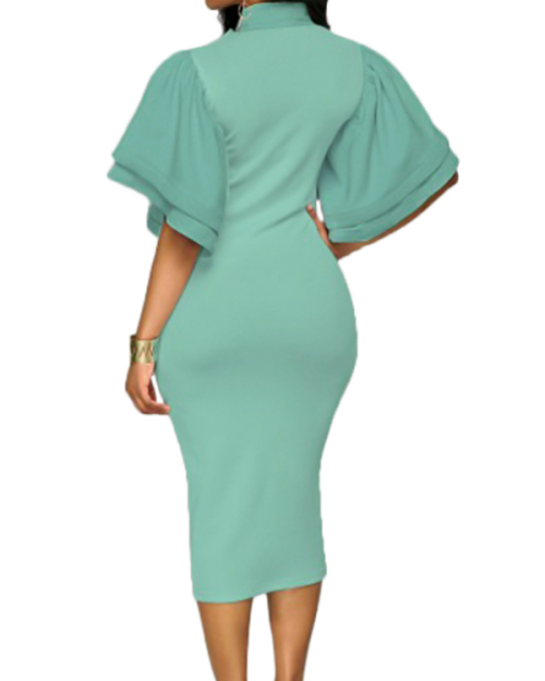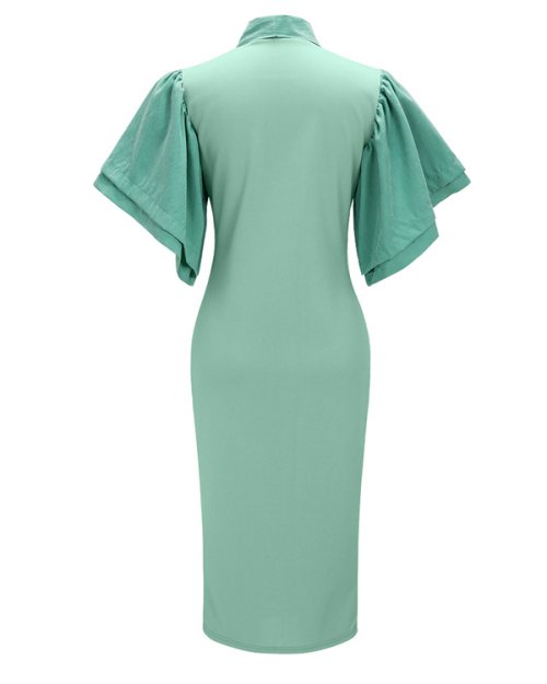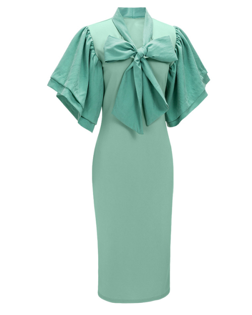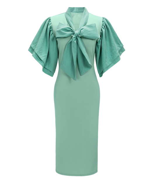 Trendy V Neck Half Sleeves Bow-tie Decoration Green Cotton Sheath Knee Length Dress