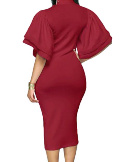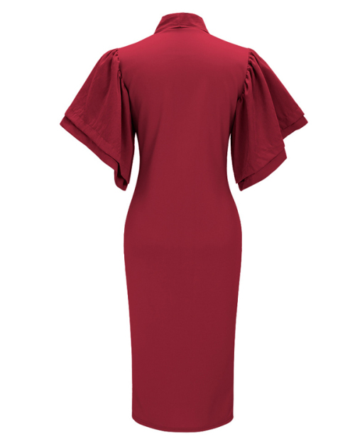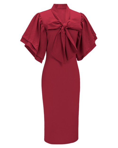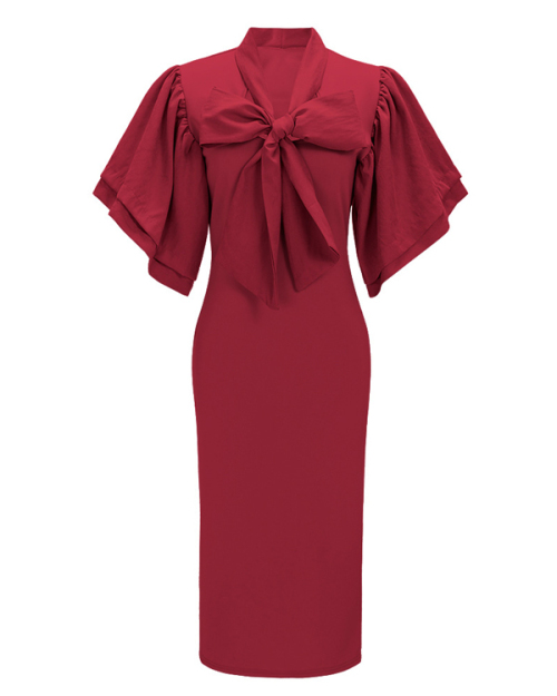 Trendy V Neck Half Sleeves Bow-tie Decoration Red Cotton Sheath Knee Length Dress