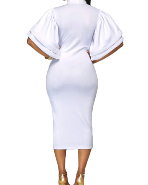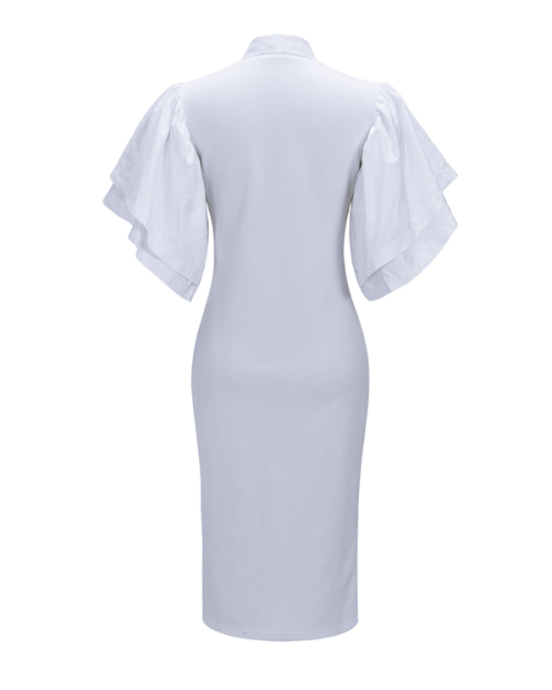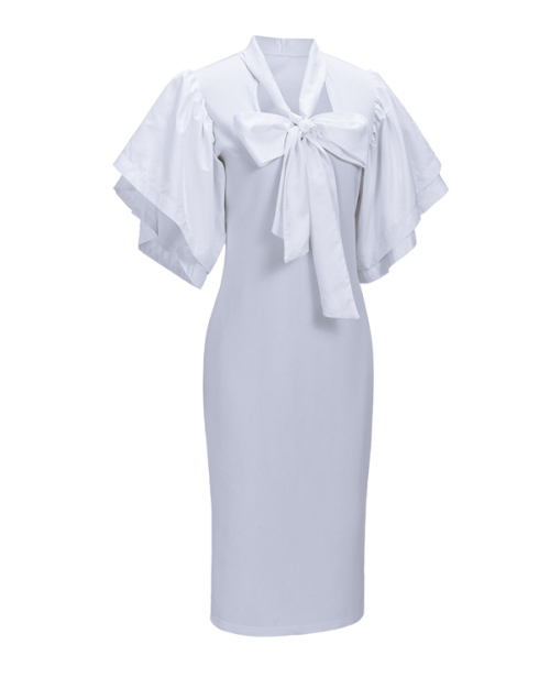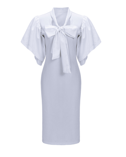 Trendy V Neck Half Sleeves Bow-tie Decoration White Cotton Sheath Knee Length Dress