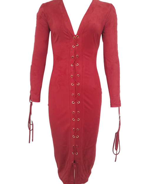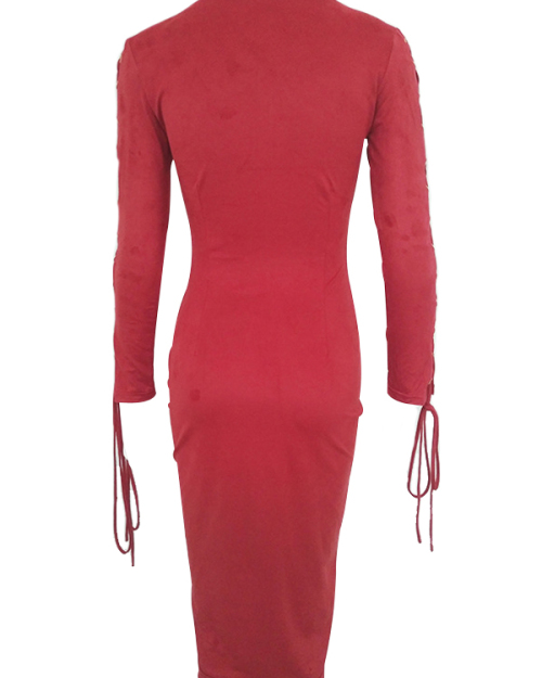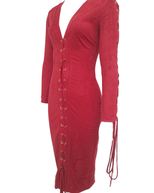 Trendy V Neck Lace-up Hollow-out Red Suede Sheath Knee Length Dress