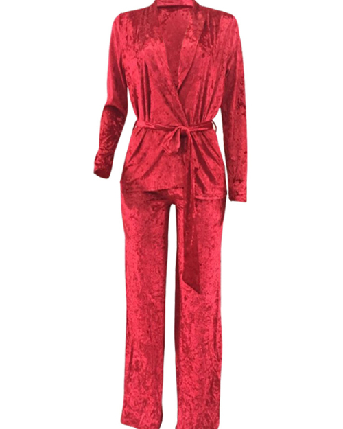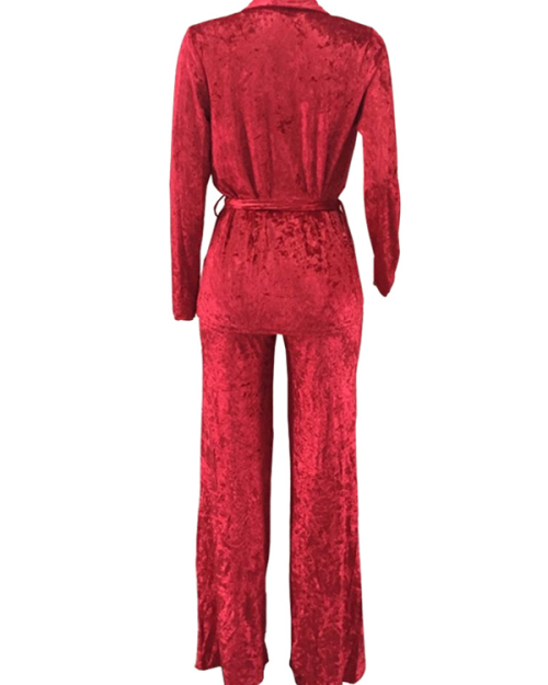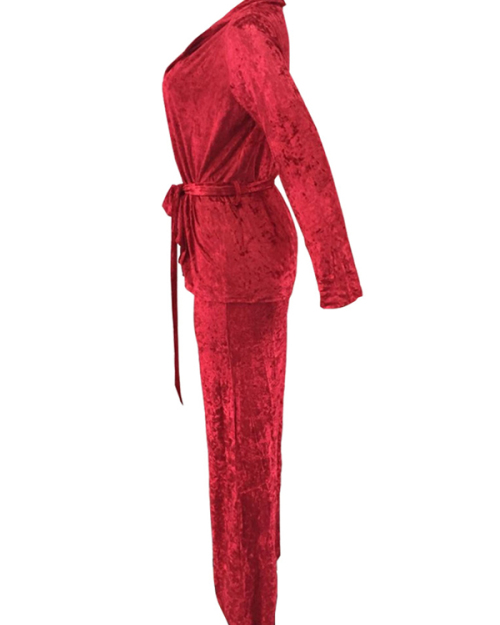 Trendy V Neck Lace-up Red Velvet Two-piece Pants Set