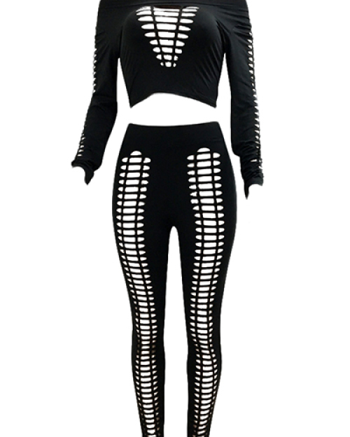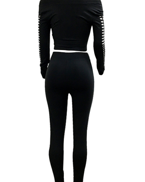 Black Qmilch Pants Solid O neck Long Sleeve Sexy Two Pieces