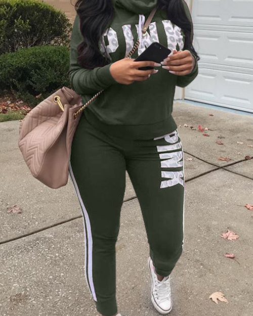 Casual Heaps Collar Striped Letters Printed Army Green Qmilch Two-Piece Pants Set