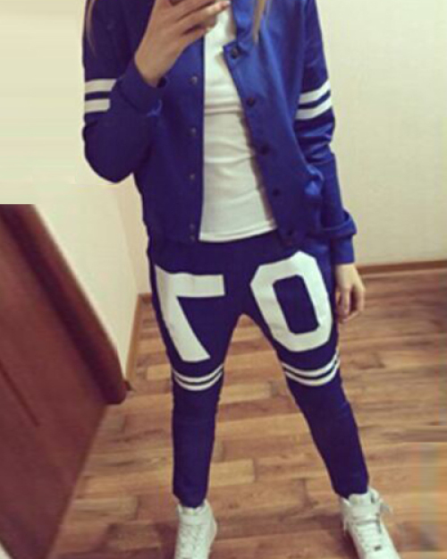 Casual Long Sleeves Print Blue Cotton Blend Two-piece Regular Sweat Set