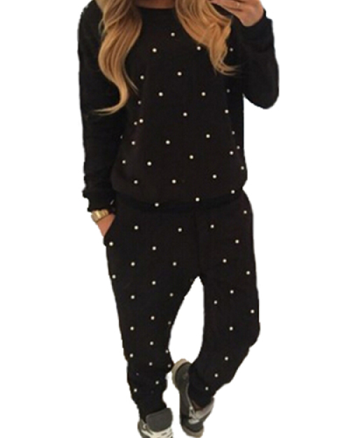 Casual O Neck Long Sleeves Beaded Solid Black Blending Two-piece Pants Set