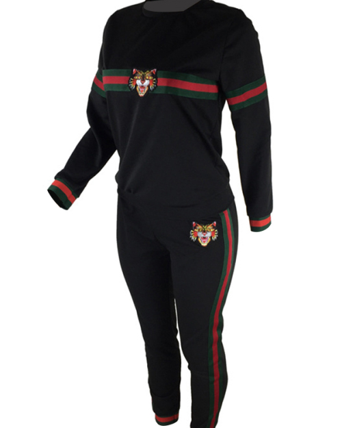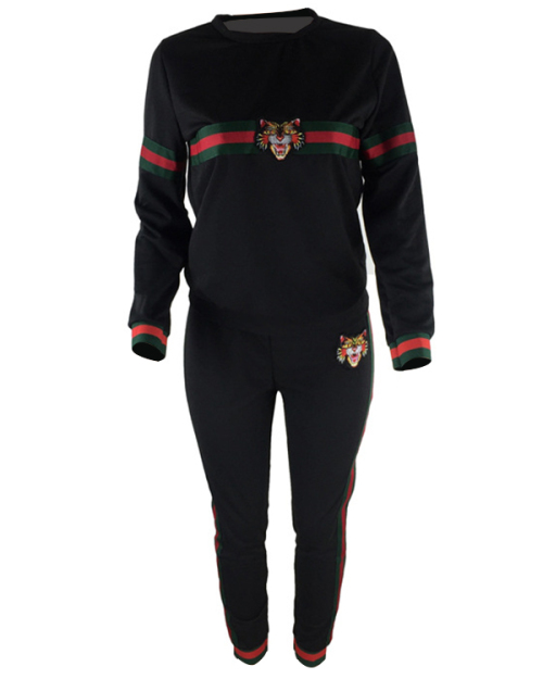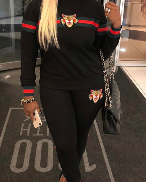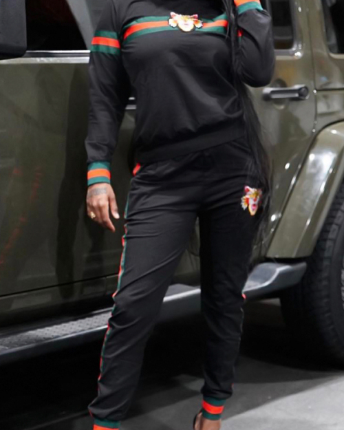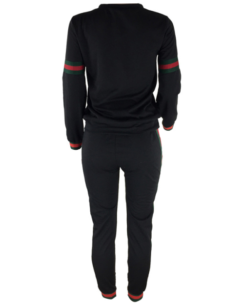 Casual Round Neck Patchwork Black Polyester Two-Piece Pants Set