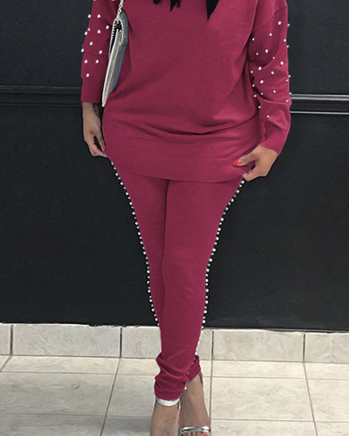 Casual Round Neck Pearl Decoration Wine Red Blending Two-Piece Pants Set