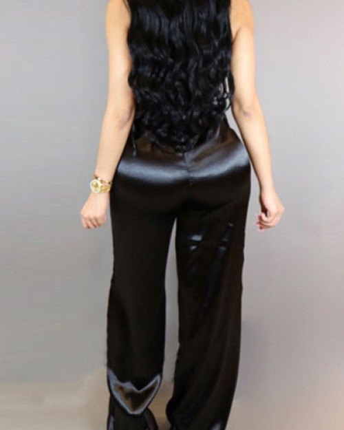 Charming Dew Shoulder High Waist Black Satin Two-piece Pants Set