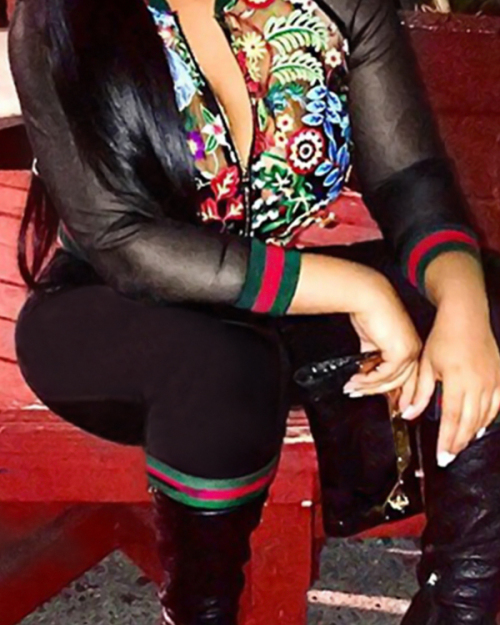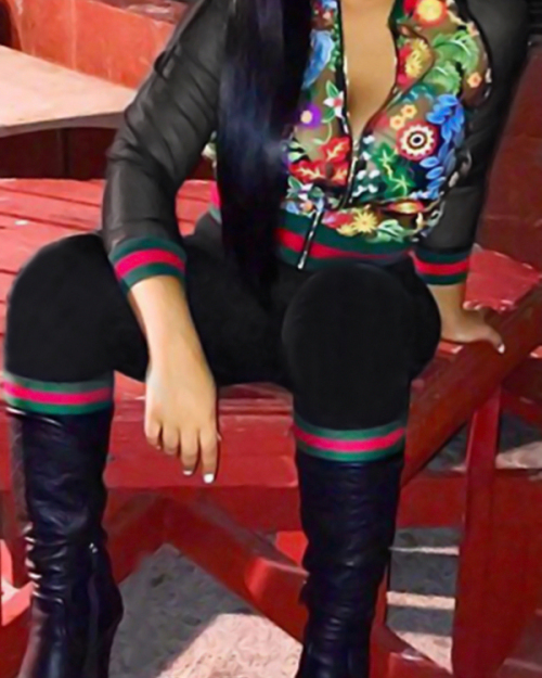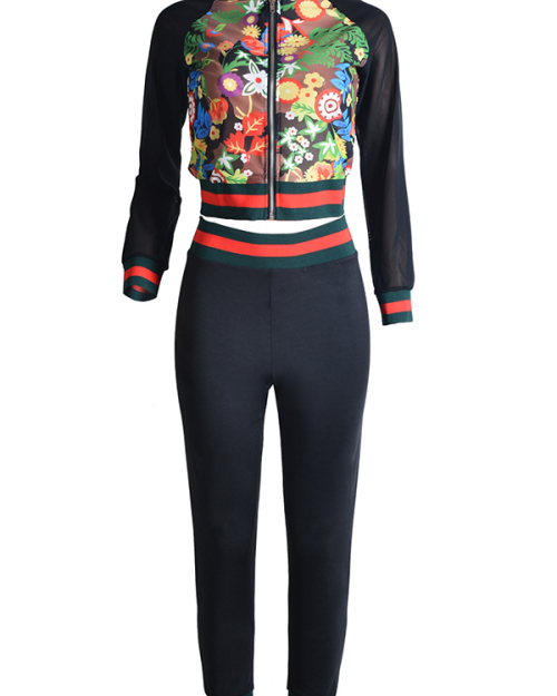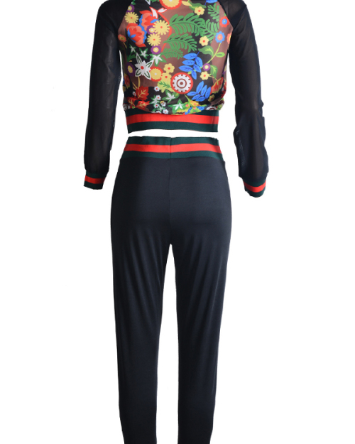 Euramerican Mandarin Collar Printed Black Polyester Two-piece Pants Set