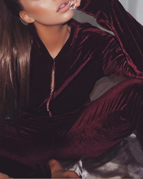 Euramerican Mandarin Collar Zipper Design Wine Red Cotton Two-piece Pants Set