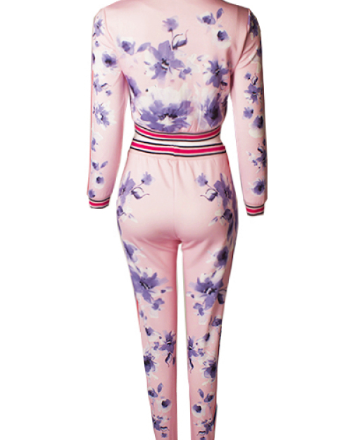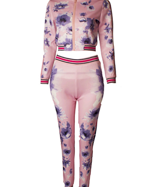 Euramerican Round Neck Long Sleeves Printed Pink Polyester Two-piece Pants Set