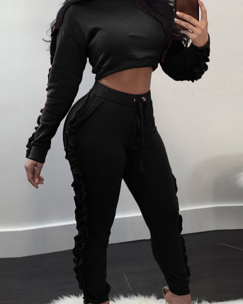 Euramerican Round Neck Ruffle Design Black Polyester Two-piece Pants Set