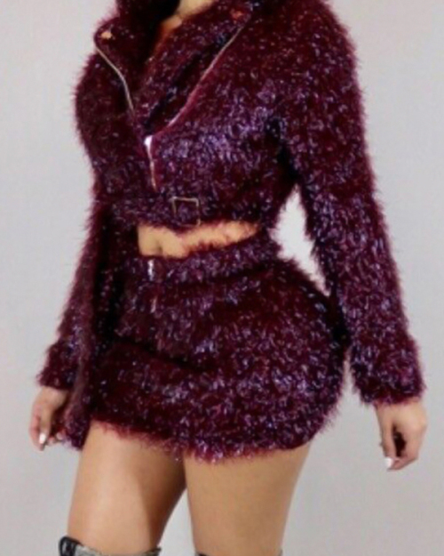 Euramerican Turndown Collar Zipper Design Purplish Red Polyester Two-piece Skirt Set