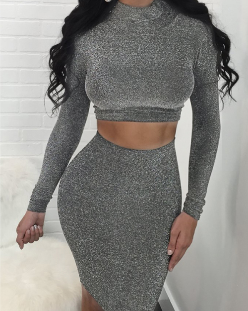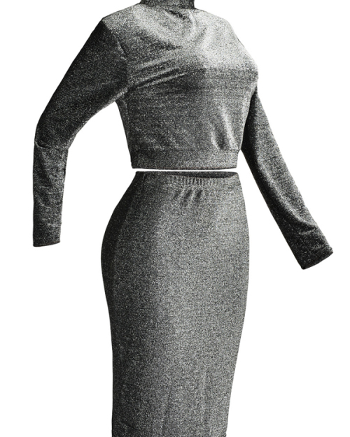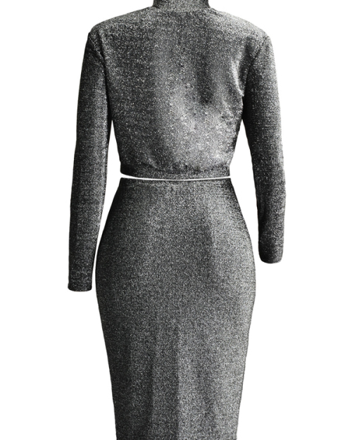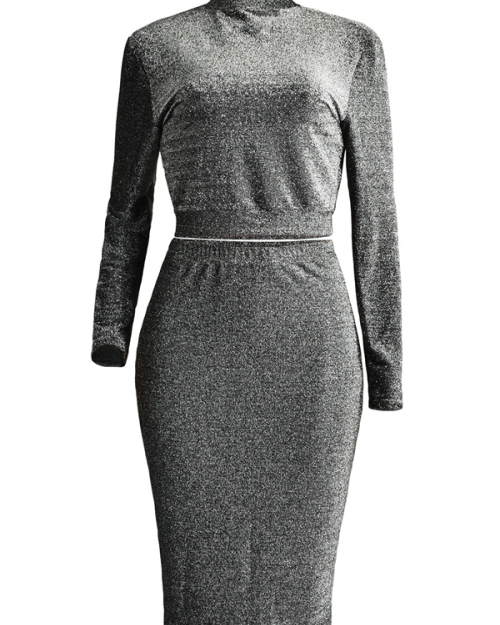 Euramerican Turtleneck Long Sleeves Black Cotton Two-piece Skirt Set
