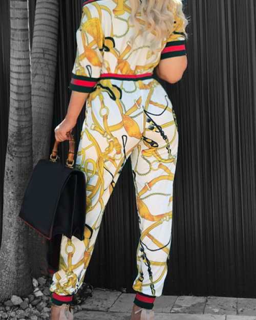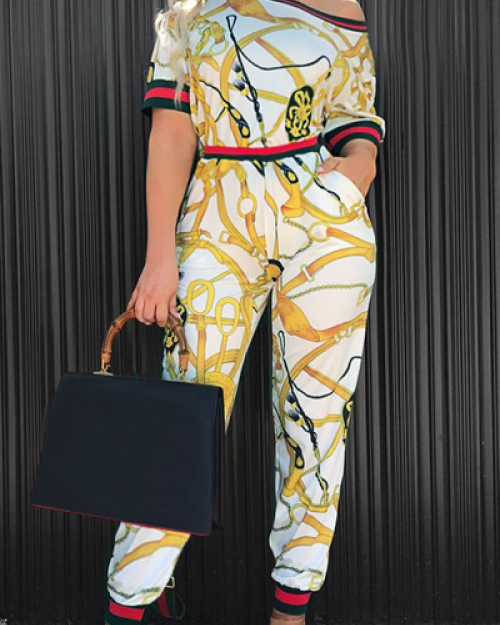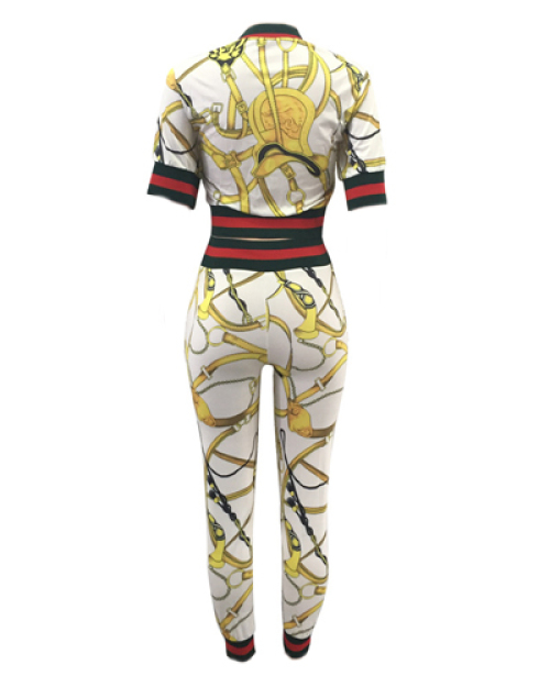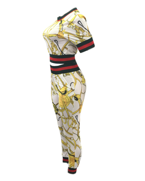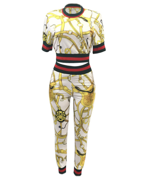 Fashion Round Neck Printed Patchwork White Cotton Two-piece Pants Set