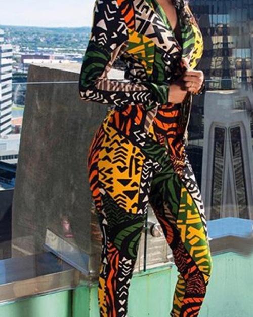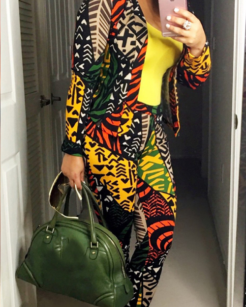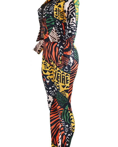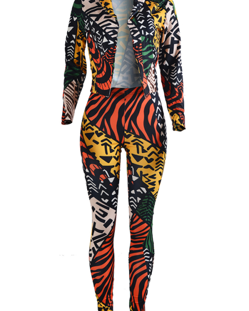 Fashionable Turndown Collar Printed Polyester Two-piece Pants Set