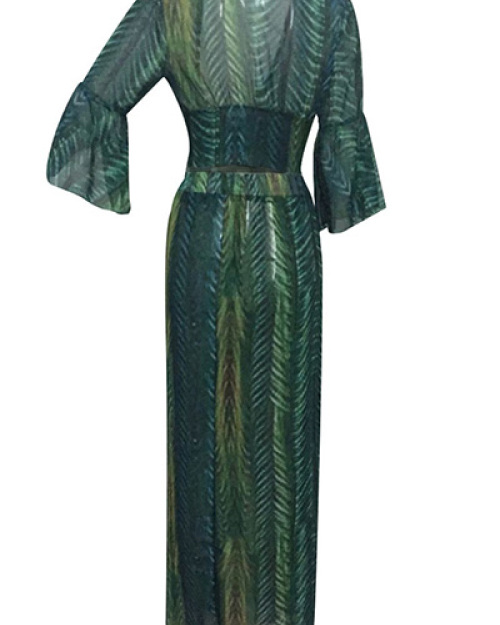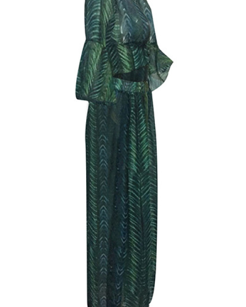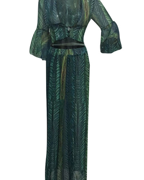 Green Chiffon Skirt Print V Neck Half Sleeve Sexy Two Pieces