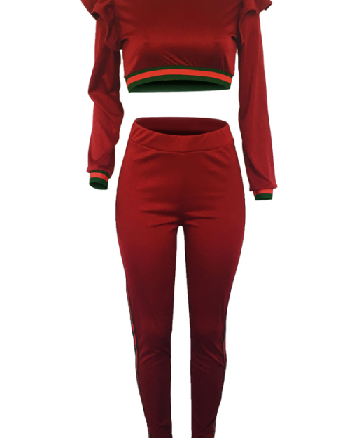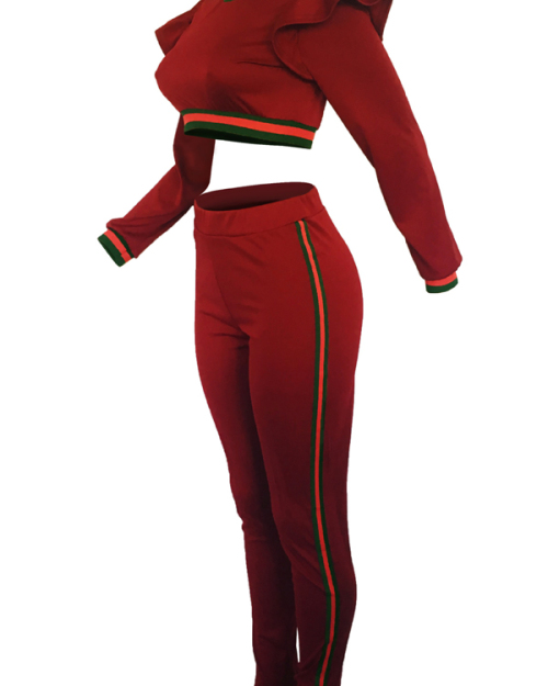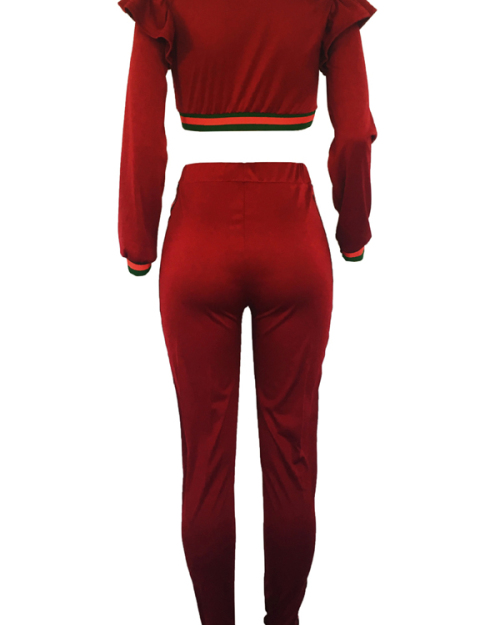Leisure Round Neck Falbala Design Wine Red Knitting Two-piece Pants Set