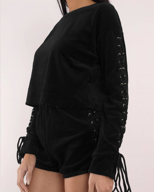 Leisure Round Neck Lace-up Black Velvet Two-piece Short Set