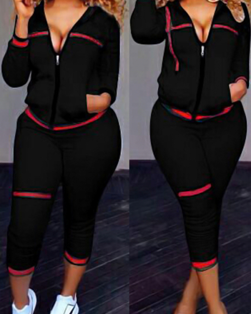 Leisure Turndown Collar Long Sleeves Zipper Design Black Knitting Two-piece Pants Set