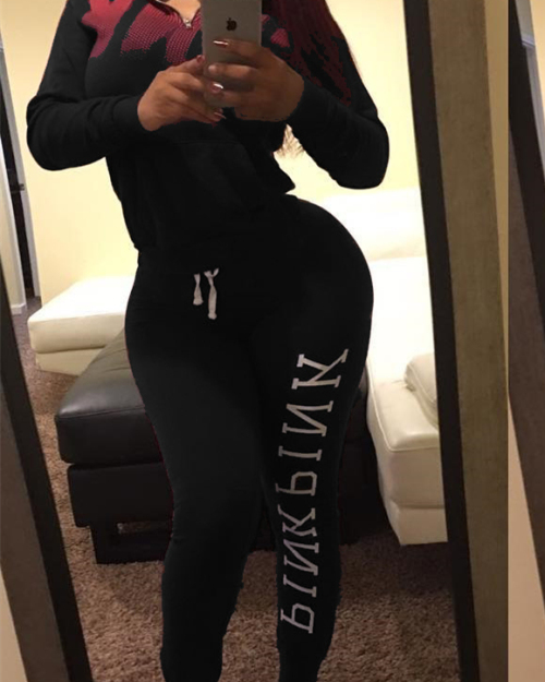 Leisure Turtleneck Long Sleeves Letters Printed Black Qmilch Two-piece Pants Set